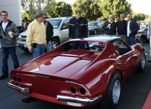We worked late Friday finishing the Rosso Rubino Metallizzato and readying it for delivery to Jon G’s on Saturday. On our way to San Diego Beau and I brought the Dino to Cars ‘N Coffe (our local Saturday morning car show). It sure drew a lot of attention. Here I am pictured with Chief Designer Freeman Thomas and Matt DeLorenzo, Editor-in-Chief at Road & Track Magazine.